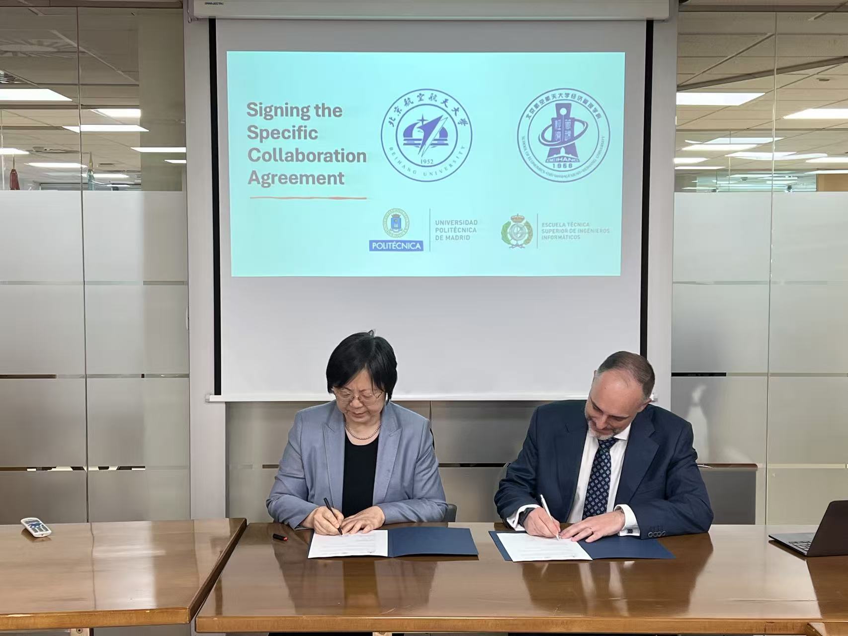 Figure 2: Signing Ceremony Site (1st from the left: Fan Ying, Dean of the School of Economics and Management; 1st from the right: Ricardo Imbert, Dean of the School of Computer Science at UPM)